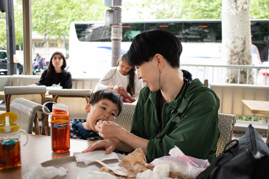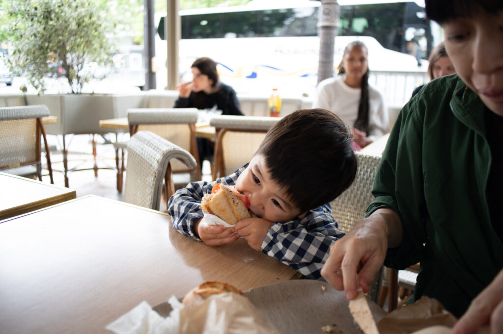 どこの店も高そうだったのでパン屋で食事をとることに。サクは嬉しそう「フランスパンおいしいねえ」とたべていた。